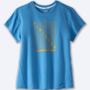 تیشرت ورزشی زنانه کریویت brooks در دل رنگ آبی آرامشبخش این تیشرت، واژهی “FINISHER” با اقتدار و تکرار عمودی نقش