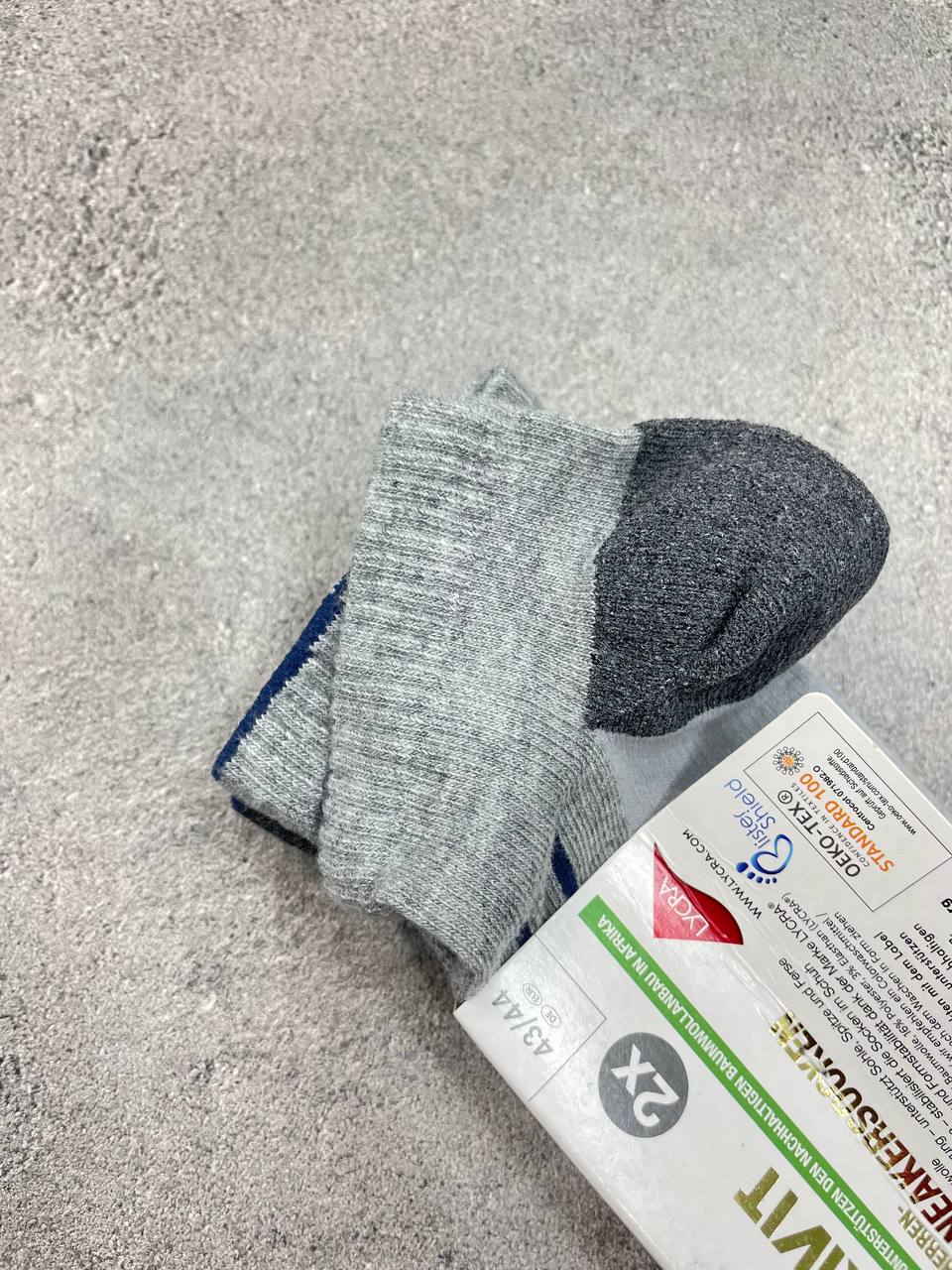 بر بستری از خاکستری آرام، دو جفت جوراب با برچسبهایی که هویتشان را فریاد میزنند، آرمیدهاند. یکی با خطوطی ملایم و رنگی روشنتر، دیگری با سایههای تیرهتر و حس عمیقتری از استواری. برند “SMARTWOOL” با افتخار روی برچسب نقش بسته، گویی وعدهی راحتی و دوام را در هر قدم میدهد.