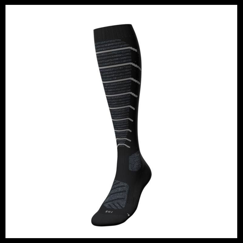جوراب ورزشی بلند و حرفهای است که تا زیر زانو را میپوشاند. طراحی آن ترکیبی از رنگ مشکی و خطوط خاکستری مدرن است که علاوه بر جلوهی زیبا، حس قدرت و استقامت را منتقل میکند. بافت تقویتی در قسمت پنجه، پاشنه و ساق باعث راحتی بیشتر و محافظت از پا در فعالیتهای ورزشی سنگین مانند اسکی یا کوهنوردی میشود. این جوراب با ظاهر شیک و کارکرد تخصصیاش، همزمان نمادی از استایل و کارایی به شمار میرود