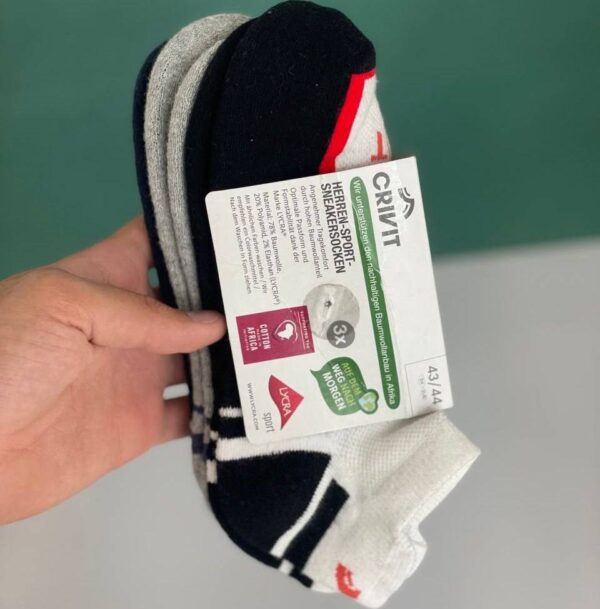 بر بستری سفید و آرام، پنج جفت جوراب مچی با رنگهایی از آبی دریا تا خاکستری مهآلود، در کنار هم آرمیدهاند. هر جفت، داستانی دارد؛ از راهراههای کلاسیک گرفته تا ترکیبهای مدرن با برند “CRIVIT” که با افتخار رویشان نقش بسته. گویی آمادهاند تا پاهای خسته را در آغوش بگیرند و همراهی کنند در مسیرهای روزمره، بیادعا اما با وقار.