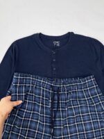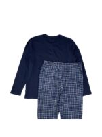 با این ست راحتی مردانه، آرامش شبانه و استایل خانگی را همزمان تجربه کنید. بلوز آستینبلند با یقه هِنلی و دکمهدار، در رنگ سرمهای ساده، ظاهری شیک و مینیمال دارد. شلوار چهارخانه آبی با کمر کشی و بند تنظیم، به همراه دمپاهای کشدار، راحتی و فیت عالی را برای استراحت یا خواب فراهم میکند.