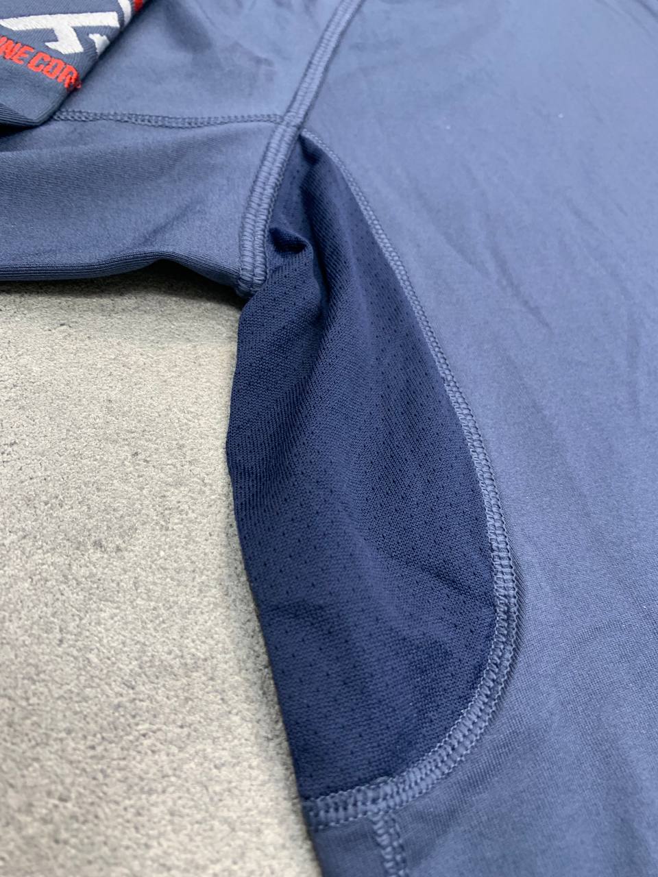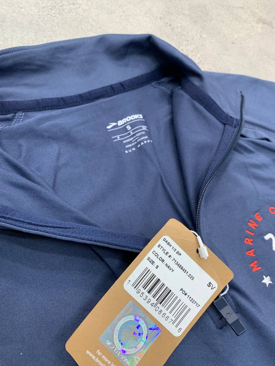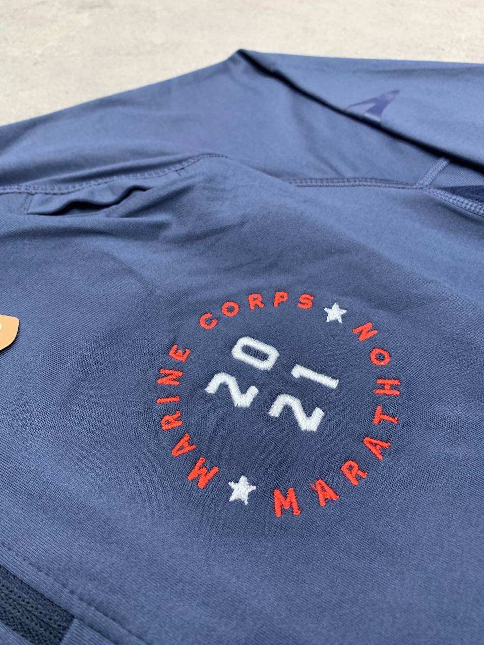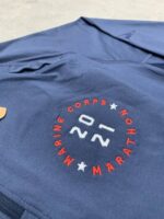 نیمزیپ ورزشی آبیرنگ با آستین بلند و زیپ نیمهاست که طراحی ساده و شیک دارد. روی سمت چپ سینه، لوگوی Marine Corps Marathon 2021 به رنگ قرمز چاپ شده و روی آستین سمت چپ نیز نماد “Marine Corps” به چشم میخورد. جنس پارچه سبک و تنفسپذیر به نظر میرسد و برای دویدن یا فعالیتهای ورزشی طراحی شده است. ترکیب رنگ تیره با جزئیات قرمز و سفید، ظاهری جذاب و حرفهای به لباس بخشیده و آن را به یک یادگار ارزشمند از ماراتن ۲۰۲۱ تبدیل کرده است